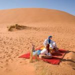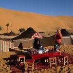 After breakfast, you will drive further towards the Sahara desert via the beautiful Todra Gorge where you will stop for lunch, after that, you will continue through Erfoud, ZiZ and Tafilalet Valley. Arrive into Merzouga, you will meet with our camel team leader Ichou. The animals are loaded up and you will ride off into the ocean of sand at the sunset. After two hours ride, you will arrive at camp place in an oasis where you will spend the night around the fare camp to enjoy the music with Moroccan food. You will be mesmerized by the desert night sky. You can sleep in a nomadic tent or under the stars.